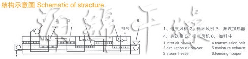 物料由加料器均勻地鋪在網(wǎng)帶上,網(wǎng)帶一般采用12-60目不銹鋼絲網(wǎng),由傳動裝置拖動在干燥機內(nèi)移動。干燥機由若干單元組成,每一單元熱風獨立循環(huán),部分尾氣由專門排濕風機排出,廢氣由調(diào)節(jié)閥控制,熱氣由下往上或由上往下穿過鋪滿物料的網(wǎng)帶完成熱量與質(zhì)量傳遞的進程,帶走物料水份。網(wǎng)帶緩慢移動,運行速度可根據(jù)物料溫度自由調(diào)節(jié),干燥后的成品連續(xù)落入收料器中。上下循環(huán)單元根據(jù)用戶需要可靈活配備,單元數(shù)量亦可根據(jù)需要選取。