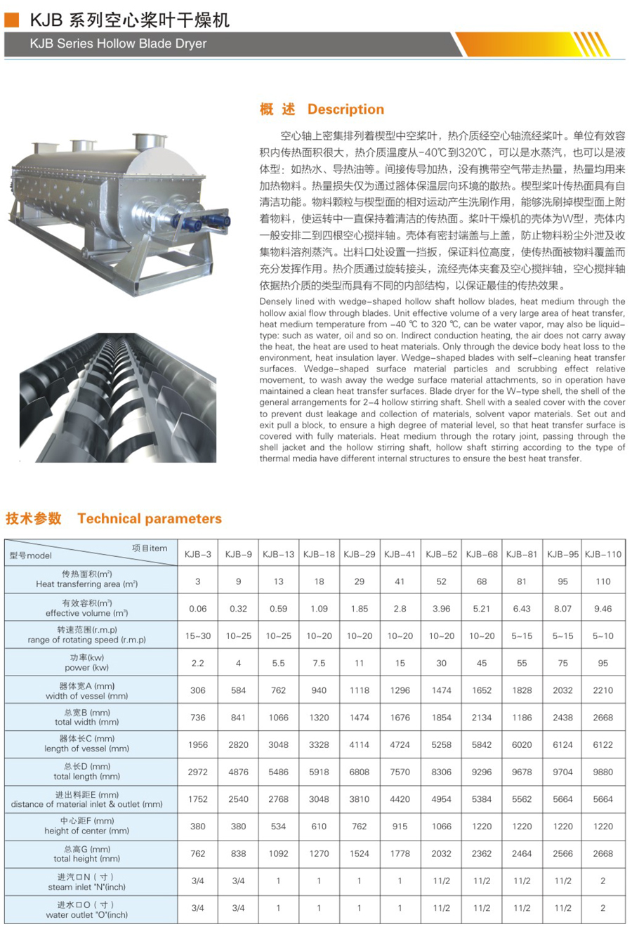 空心軸上密集排列著楔型中空槳葉,熱介質經空心軸流經槳葉。單位有效容積內傳熱面積很大,熱介質溫度從-40℃到320℃,可以是水蒸汽,也可以是液體型:如熱水、導熱油等。間接傳導加熱,沒有攜帶空氣帶走熱量,熱量均用來加熱物料。熱量損失僅為通過器體保溫層向環境的散熱。楔型 槳葉傳熱面具有自清潔功能。物料顆粒與楔型面的相對運動產生洗刷作用,能夠洗刷掉楔型面上附著物料,使運轉中一直保持著清潔的傳熱面。槳葉干燥機的殼體為W型,殼體內一般安排二到四根空心攪拌軸。殼體有密封端蓋與上蓋,防止物料粉塵外泄及收集物料溶劑蒸汽。出料口處設置一擋扳,保證料位高度,使傳熱面被物料覆蓋而充分發揮作用。熱介質通過旋轉接頭,流經殼體夾套及空心攪拌軸,空心攪拌軸依據熱介質的類型而具有不同的內部結構,以保證最佳的傳熱效果。