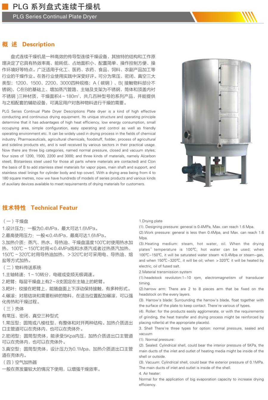 盤式干燥機是一種高效的傳導型連續干燥設備。其獨特的結構和工作原理決定了它具有熱效率高、能耗低,占地面積小、配置簡單、操作控制方便、操作環境好等特點,廣泛適用于化工、醫藥、農藥、食品、飼料、農副產品加工等行業的干燥作業。